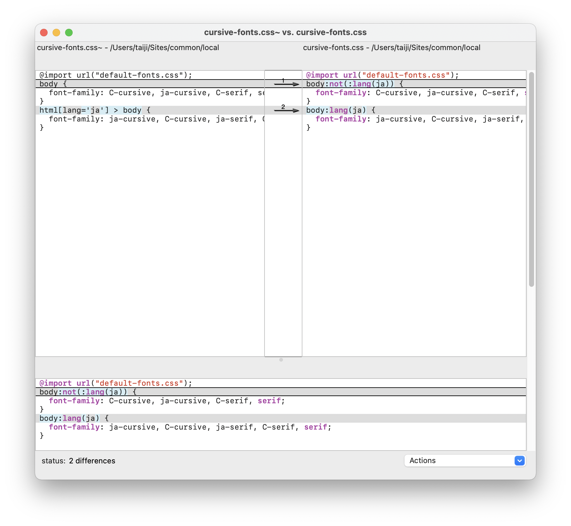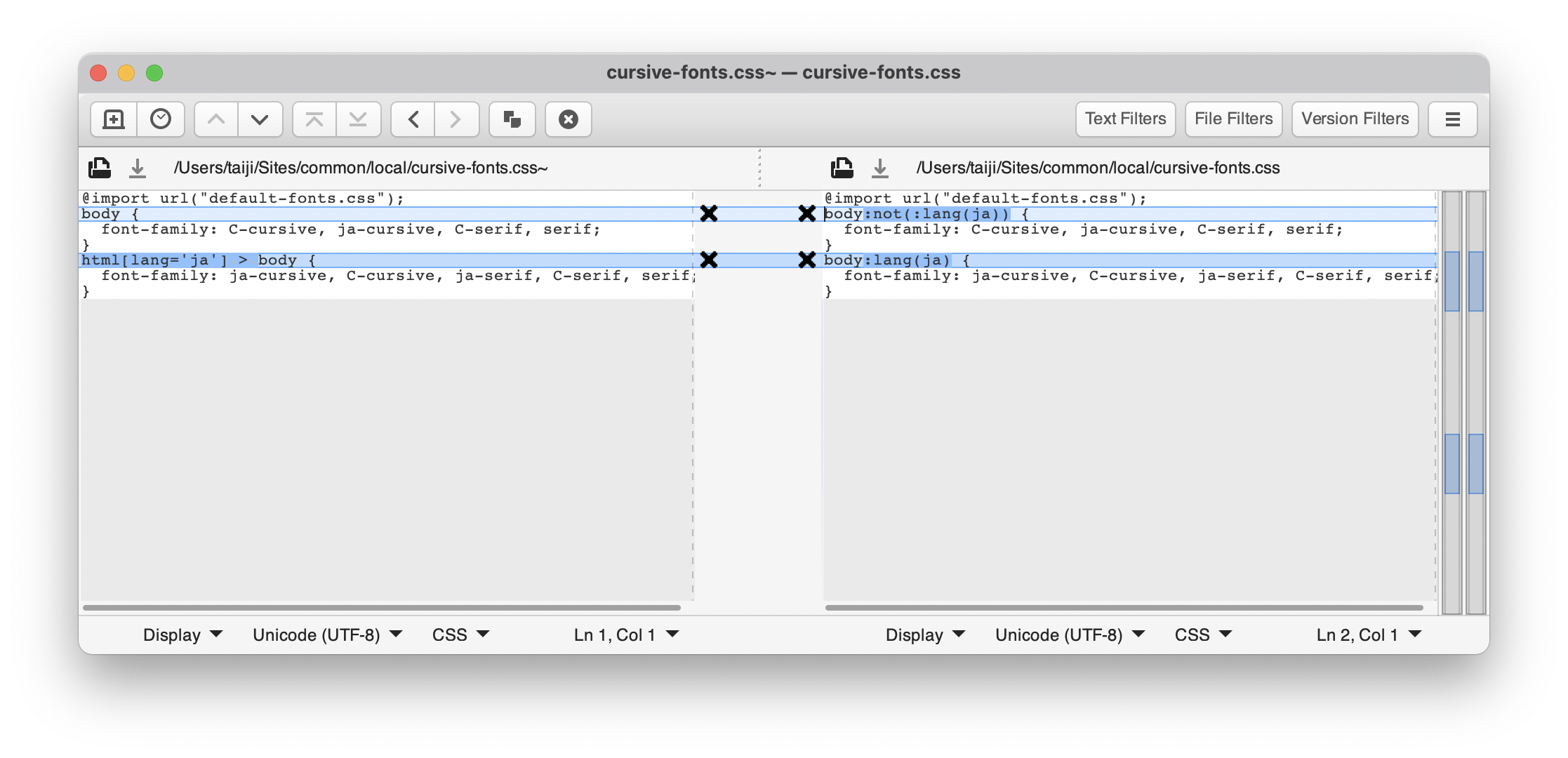 patch --dry-run < cursive-fonts.css.patchcursive-fonts.css ファイルが旧ファイルなら新ファイルが自動生成されて、元のファイルは cursive-fonts.css.orig に変更されます。patch --dry-run -R < cursive-fonts.css.patchcursive-fonts.css.orig に変更されます。
