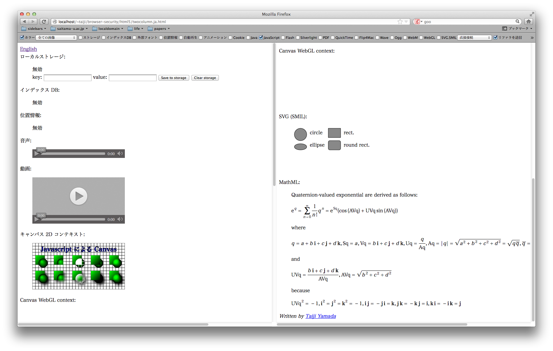 昨今はブラウザも機能過多になり、枯れていない技術だと特にその脆弱性が狙われやすく、使っていない機能は是非とも無効にしておきたいものです。以下のサイトは、ブラウザの機能や設定を確認するために作成したものですのでどうぞ活用して下さい。