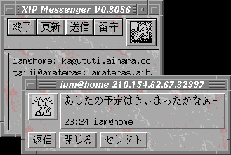 % ipmsg.pl -i ~/include/X11/bitmaps/oneko/awake.xbm -T there