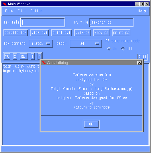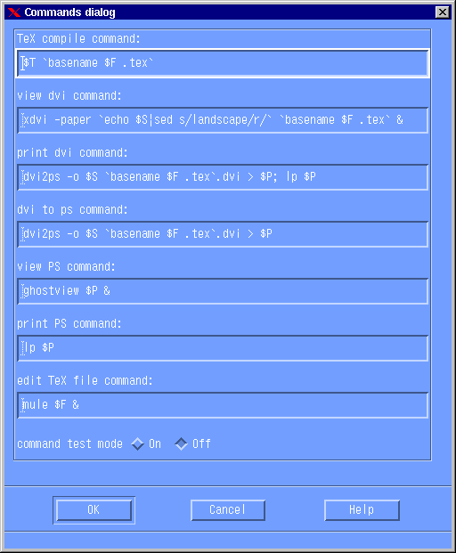 TeXchan version 3.x is based on Motif and CDE(Common Desktop Environment). You can customize all commands; latex, dvi2ps, xdvi, gs and so on in the Commands Dialog or X resource file.