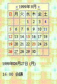 xcalendar.cgi はデフォルトで今月のカレンダーを表示し、今日の予定データが存在すれば、予定データの内容も併せて表示します。'>' リンクで次の月、'<' リンクで前の月のカレンダーを表示します。リンクがある日付は、その日の XCalendar のデータが存在することを示しています。そこを閲覧すると、その日の予定データを表示します。