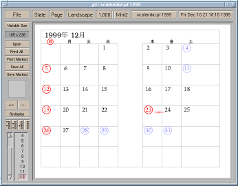 2000年のカレンダーの実行例をいくつかあげておきますので、詳細は `-help' を読んでお使い下さい。祝祭日、休日のデータ作成については、オリジナル xcalendar(1) のマニュアル及び、拙作の XCalendar の休日ファイル拡張パッチについてのサイトを御覧下さい。
